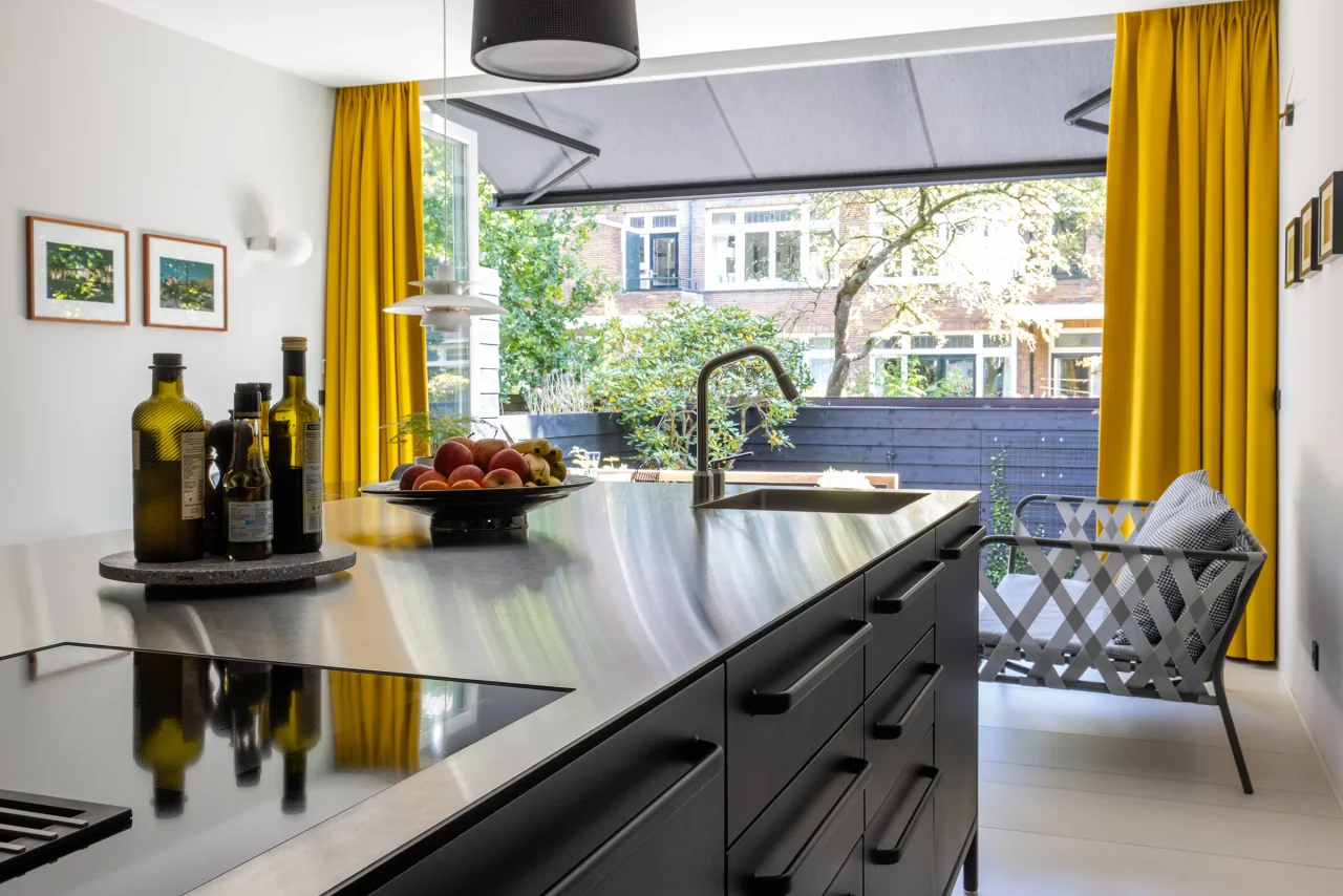 De constructie van de woning is aangepast om de volledige breedte van de woning vrij de kunnen indelen. Aan de achterzijde is de woning uitgebouwd. De nieuwe leefkeuken aan de achterzijde heeft een vouwpui over de gehele breedte van de woning waardoor de tuin naar binnen gehaald wordt en de leefkeuken een optimale lichtinval heeft. De tuin en de veranda aan de achterzijde tevens naar ontwerp van Arnold van Ouwerkerk uitgevoerd.